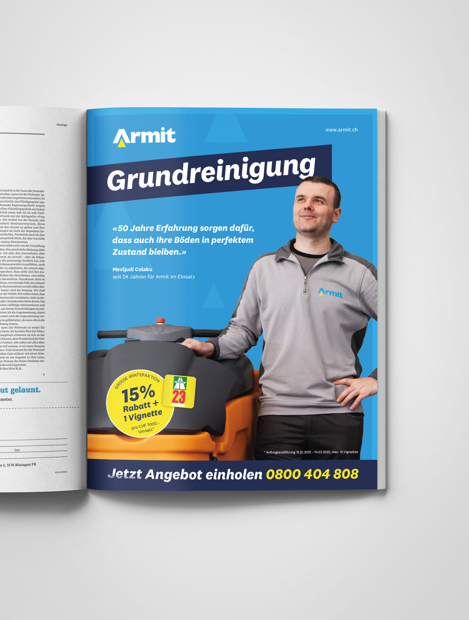 Die Geschäftsleitung der Firma «Armit» entschied sich dafür, ihr Erscheinungsbild zu erneuern. Mit Ausnahme des Logos, welches nur leicht überarbeitet wurde, entstand ein komplett neuer Auftritt mit Fokus auf dem Redesign der Website. Im Zentrum des neuen Brandings stand dabei die langjährige Belegschaft von Armit. Als stolze, zufriedene Mitarbeiter wurden sie in ihrem Arbeitsumfeld abgelichtet, um dem Beruf der Reinigungskraft und dem Unternehmen ein frisches Gesicht zu geben.